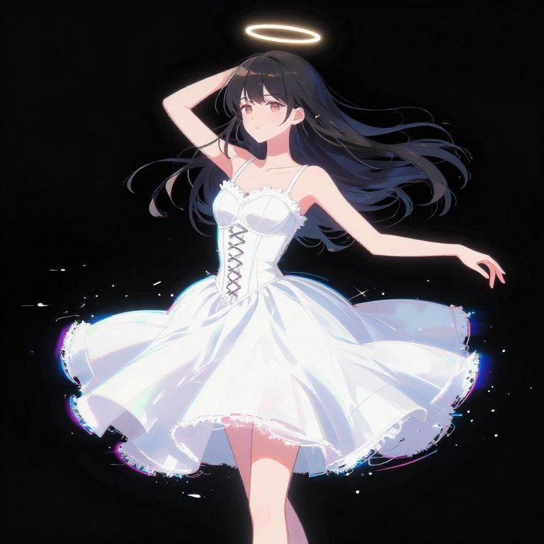 Digital anime-style illustration of a young girl with long black hair wearing a flowing white corset dress. She is captured mid-dance against a black background, featuring subtle glitch effects and chromatic aberration. A glowing halo hovers above her head, emphasizing a celestial or angelic theme.