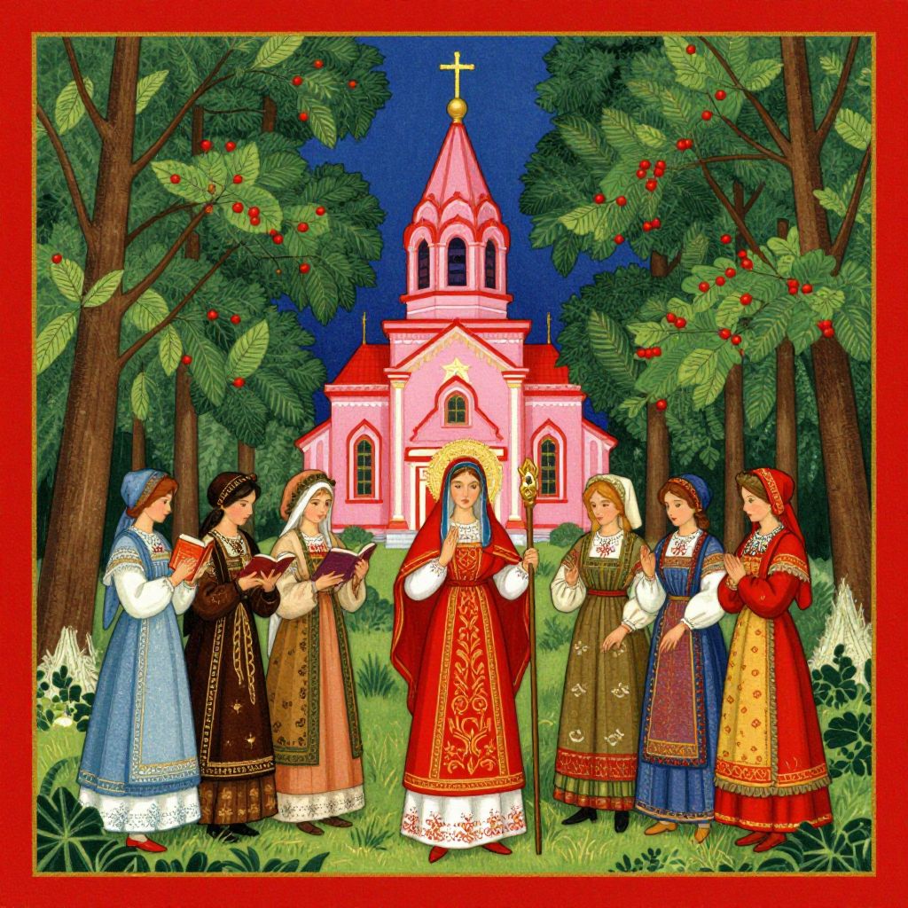 The image is a beautifully crafted Russian Christmas card with a religious theme, reminiscent of Mary Blair's style. The scene is set in a lush, forested area with vibrant green trees adorned with red berries, creating a serene and festive atmosphere. In the foreground, a group of women, dressed in traditional Russian attire, engage in various activities, such as holding a book and a staff, suggesting a narrative of faith and community. The central figure, a woman in a red dress with intricate gold embroidery, stands out prominently, possibly representing a religious figure or a significant character in the scene. In the background, a majestic pink and red church with a prominent cross stands tall, symbolizing the religious significance of the setting. The church is surrounded by a dark blue sky, adding a dramatic contrast to the warm colors of the scene. The overall composition is balanced, with the church and the forest framing the central figures, creating a harmonious and visually appealing arrangement. The use of vibrant colors, detailed textures, and intricate patterns enhances the depth and richness of the image, making it a captivating representation of Russian Christmas traditions and religious themes.