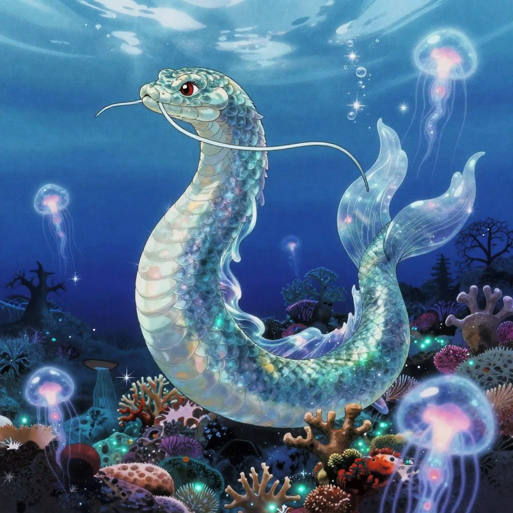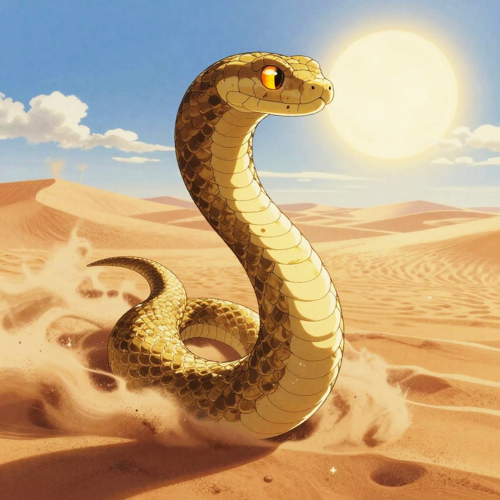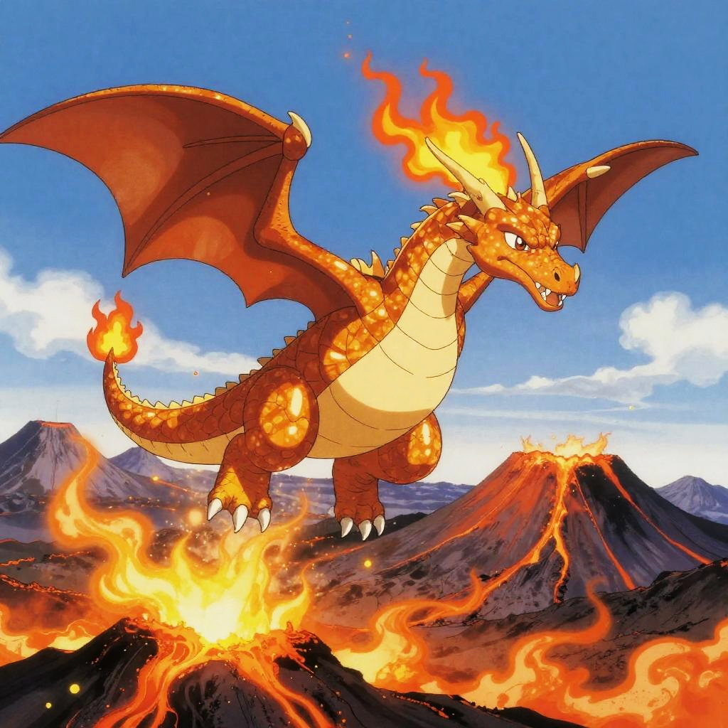 A sun dragon hatchling, with glistening amber scales, a small crown of flickering solar flames, soaring over a fiery volcanic plateau glowing under midday sun, surrounded by embers dancing on the wind and golden sparks, drawn in the majestic and symbolic anime style of Osamu Tezuka.
