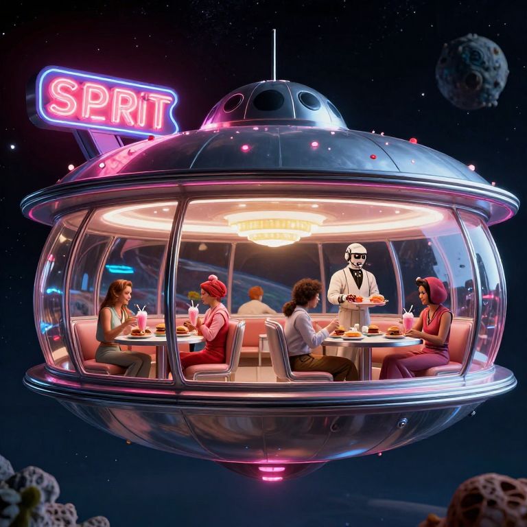 A 1960s-style space diner shaped like a flying saucer with chrome and glass surfaces, floating in outer space on a distant planet. Inside, patrons dressed in retro-futuristic clothing enjoy milkshakes and burgers while being served by a robotic waiter. The neon sign 'SPRIT' glows brightly outside, with alien landscapes and stars visible through the windows.