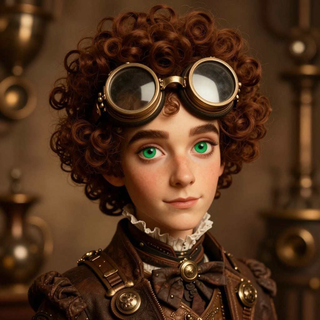 Curly brown hair green eyes, whimsical steampunk setting, a character with tight curls and striking green eyes wearing vintage goggles and Victorian-inspired attire, intricate metallic accessories, warm sepia tones, imaginative and detailed background.