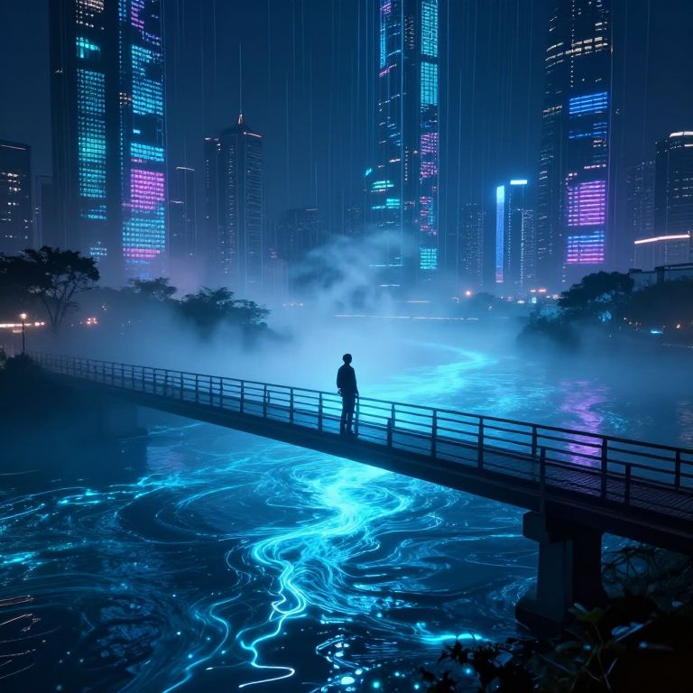 Denwa0214 standing at a bridge over a glowing river of liquid data, reflections showing alternate timelines, mist rising from the surface, futuristic city skyline in the distance, dynamic lighting, dreamlike atmosphere, cinematic focus, Dall-E style