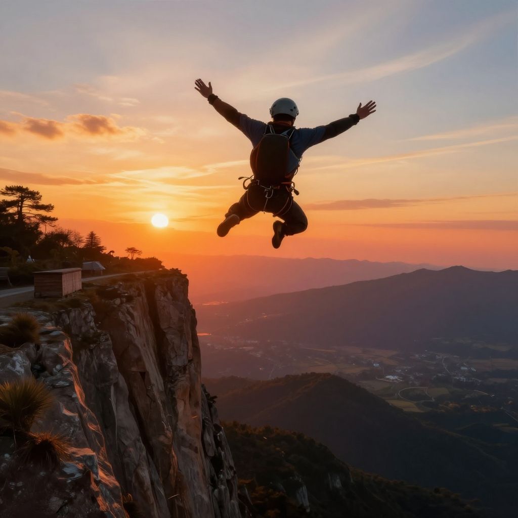 Style of Eugne Atget, a breathtaking high-definition digital painting artwork: a daredevil base jumper leaping off a towering cliff into a stunning sunset, arms outstretched, dynamic dramatic lighting, breathtaking aerial view, high adrenaline rush, pure euphoria, electrifying, thrilling, cinematic atmosphere, made in Photoshop, highly detailed, trending on ArtStation.