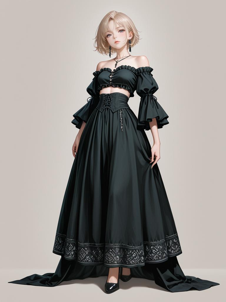 Full-body portrait of a young woman with short blonde hair wearing a black boho chic two-piece dress featuring a ruffled off-the-shoulder cropped top and a flowing high-waisted skirt with intricate embroidery near the hem. She accessorizes with black earrings, a necklace, and black high heels. The background is a plain light-colored studio setting.