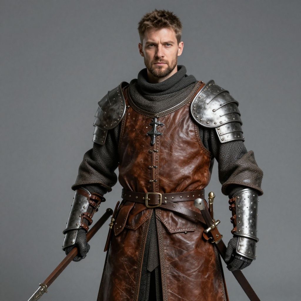 Photograph of a bearded man in medieval-style armor, wearing a brown leather tunic, black chainmail, and holding a sword, against a