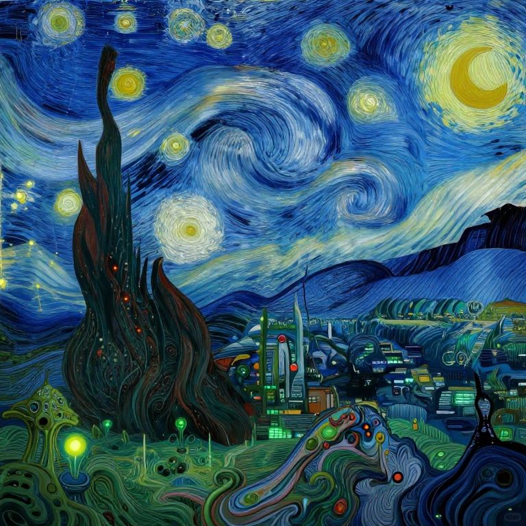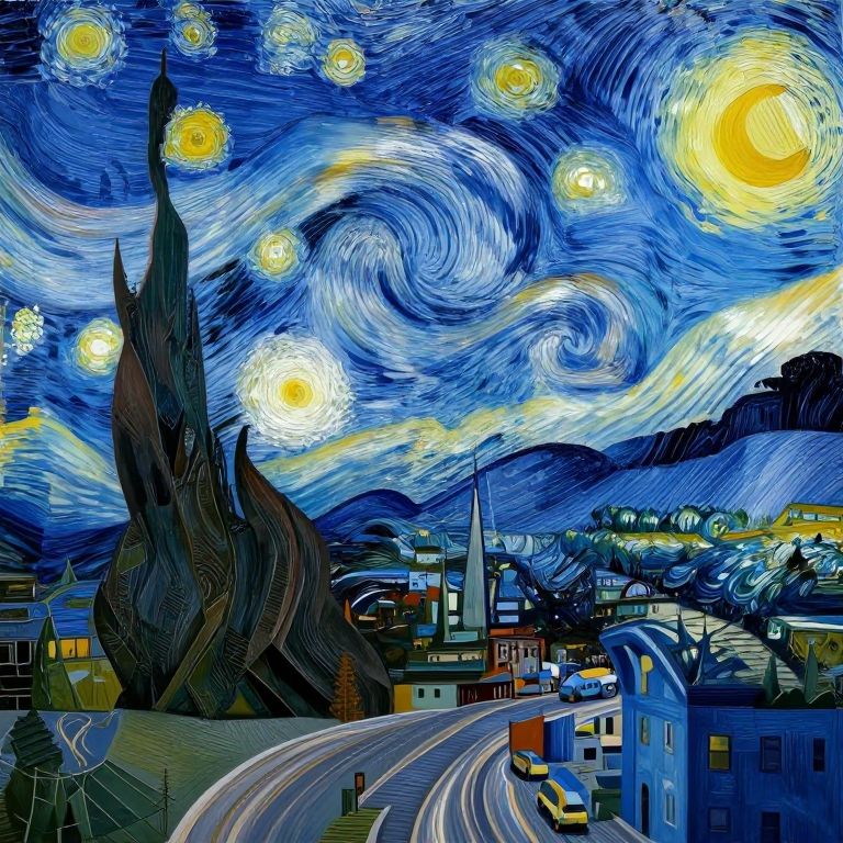 Imagine a captivating blend of Cubist architecture and swirling Starry Night landscapes, where a three-dimensional cityscape arises from a starlit sky. Angular buildings and twisted streets are painted in vibrant shades of blue and yellow, creating a dynamic interplay between form and color. From an elevated 'bird's-eye view' perspective, this surreal urban dreamscape reflects the enigmatic beauty and energetic essence of its imaginative world, soaring high above the city.