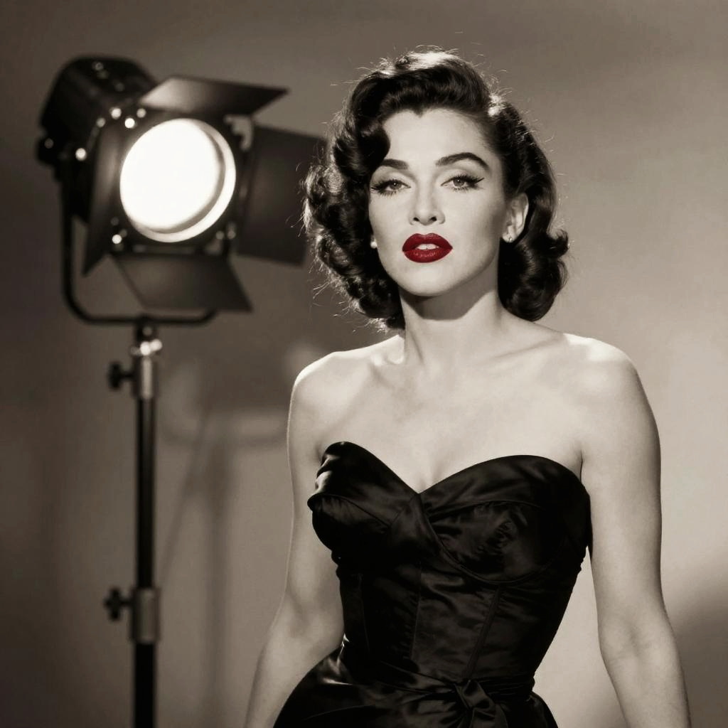 Madonna with black hair, vintage 1950s Hollywood glamour, classic red lipstick, elegant black satin dress, retro studio lighting, sepia tones, timeless beauty