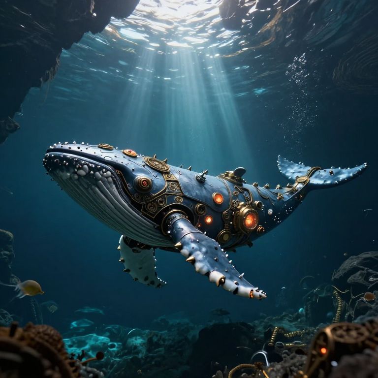 A steampunk-inspired mechanical whale glides gracefully through a cavernous underwater passage, its intricate body adorned with glowing orange lights and metallic spikes, as sunlight filters through a distant opening above.