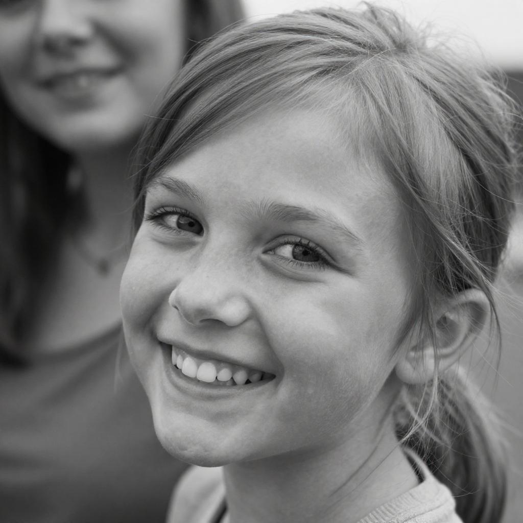 Photograph of three smiling children. Center girl with light brown hair in pink jacket, flanked by two boys, one in red plaid, one in blue shirt. Bright outdoor setting with blurred trees in background. Close-up, shoulder-to-shoulder.
