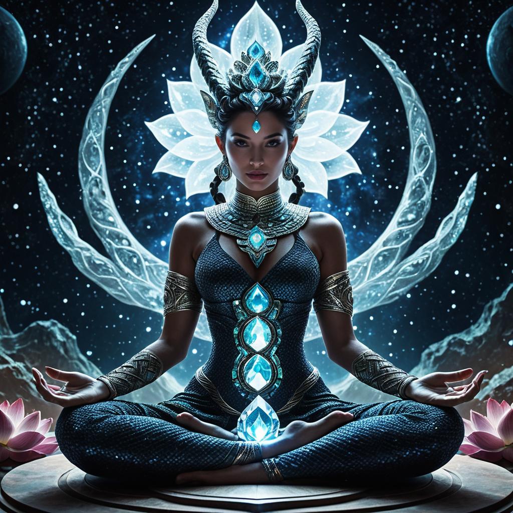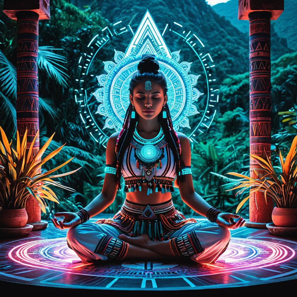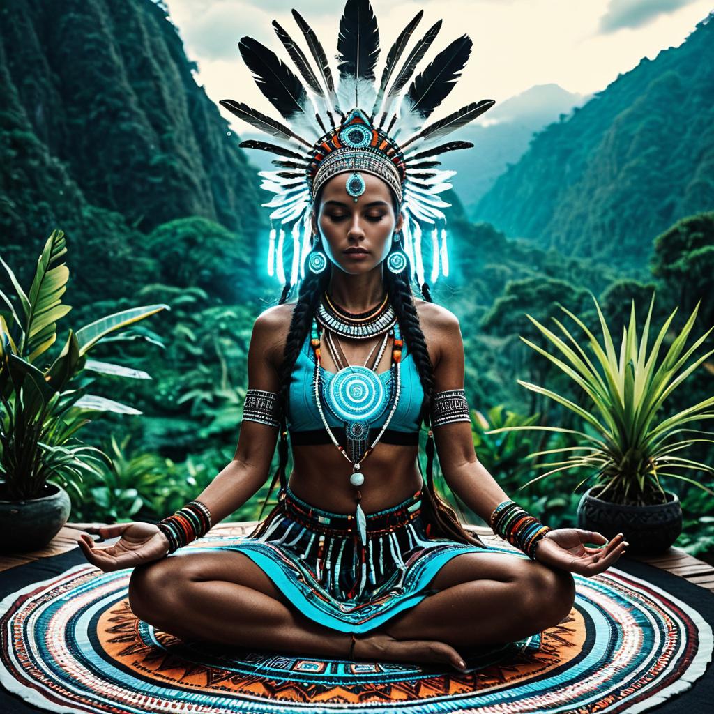 A beautiful young woman in tribal attire meditating in the Terras Indígenas, experiencing a powerful Kundalini awakening. The setting reflects Neo-Tupi synthwave, blending traditional indigenous elements with futuristic, cyberpunk-inspired designs. The woman is surrounded by glowing, ethereal energy, representing the awakening of her Kundalini. Her attire is rich with intricate patterns, feathers, beads, and other natural elements, while neon accents and technological details intertwine with the natural surroundings. The background features the lush landscape of the Terras Indígenas, with vibrant flora and futuristic elements woven into the scenery. The atmosphere is serene yet powerful, blending spiritual awakening with a unique futuristic tribal aesthetic