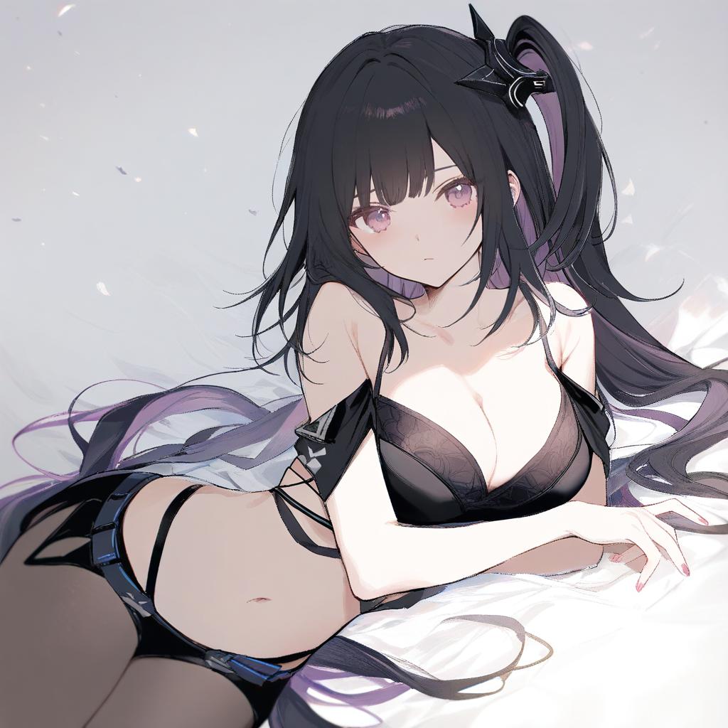 Architect (girls' frontline), girls' frontline, 1girl, pink eyes, purple eyes, black hair, very long hair, side ponytail, hair ornament, medium breasts, large breasts, cleavage, navel, collarbone, bare shoulders, pink nails, nail polish, one side up, by artist boyano, animagine