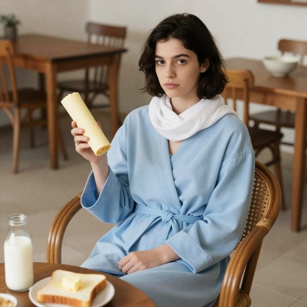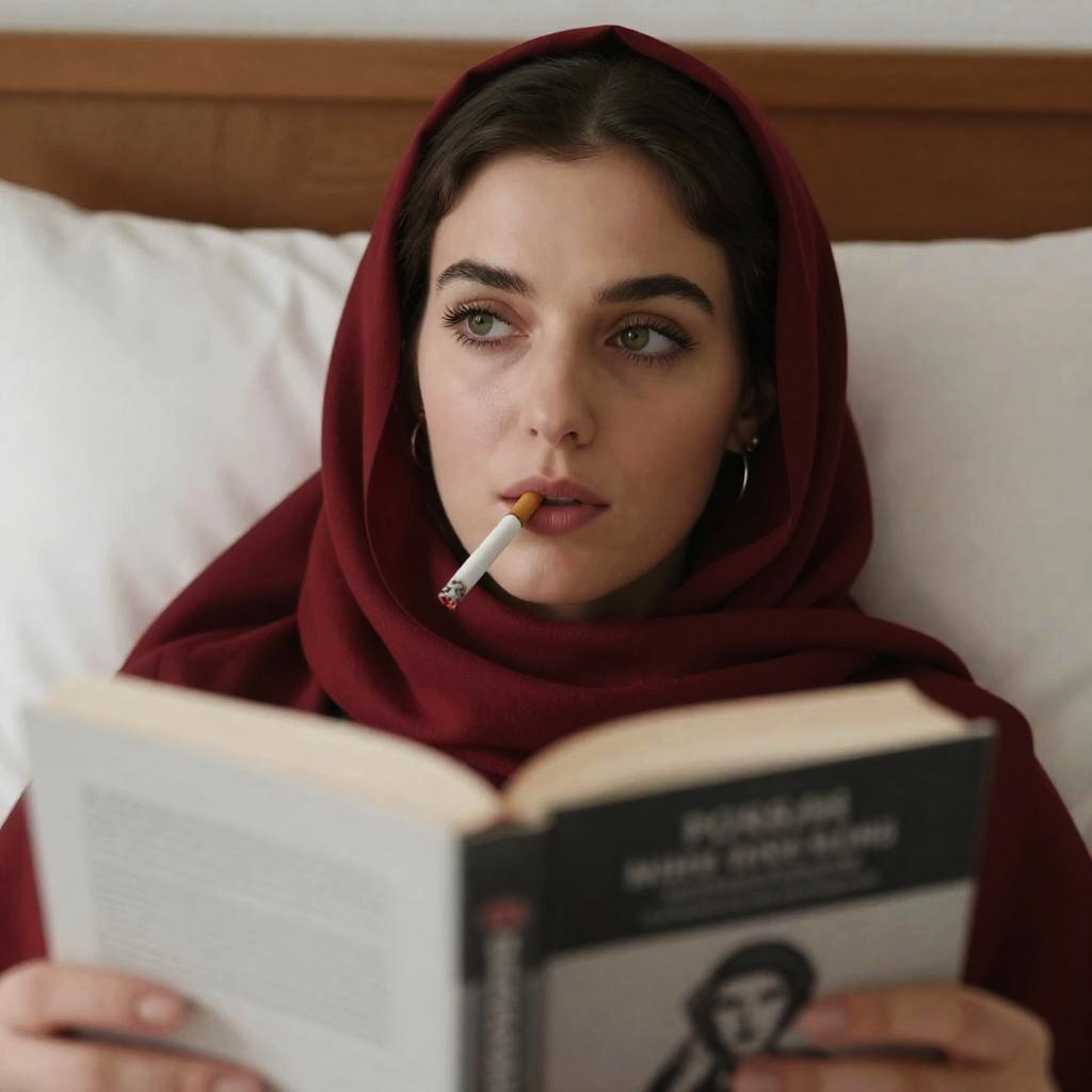 Woman with pink towel wrapped around head, sitting in brown leather chair, reading turquoise book titled "Edika 2: Momo Sadrēņu Gaidinošās". Background filled with stacked books. Woman's face shows slight confusion. Book covers in various colors.