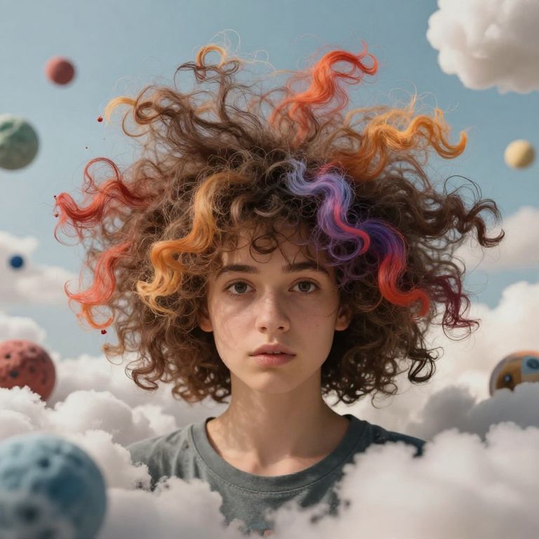 A digital photograph of a young person with a large, curly afro hairstyle featuring vibrant, multicolored strands in red, orange, purple, and blue. They have fair skin, large brown eyes, and wear a simple gray shirt. The background is a bright, clear blue sky filled with fluffy white clouds and floating, colorful planet-like objects. The person's expression is neutral, and the overall style is surreal and whimsical, blending realistic and fantastical elements. The lighting is natural, enhancing the vivid colors and textures.