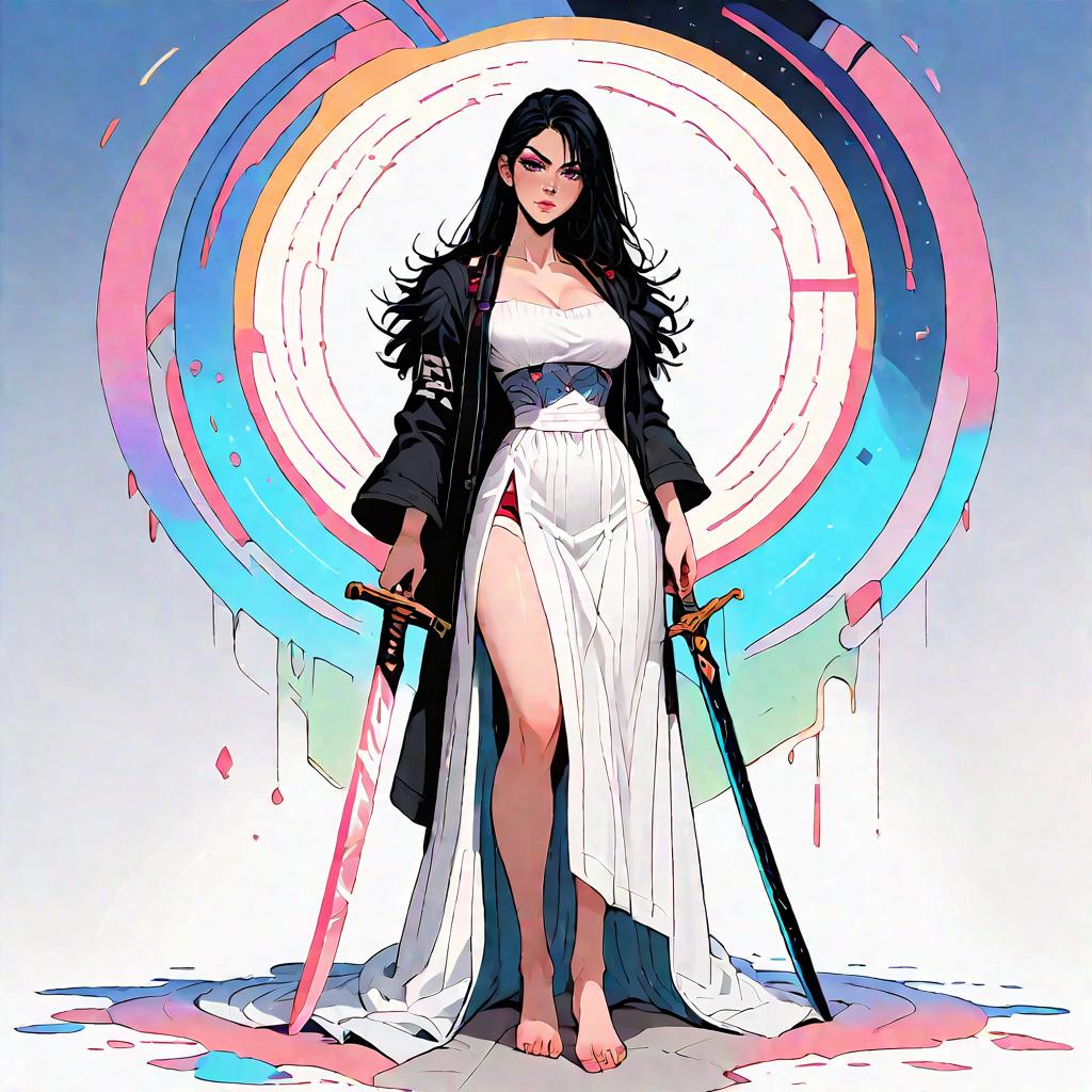 Stylized anime illustration of a barefoot woman with black hair standing confidently in a flowing white dress and black coat, holding two swords. The background features a colorful circular abstract design with blue, pink, and orange hues. The character has a toned, curvy body and wears a corset-like belt and visible underwear.