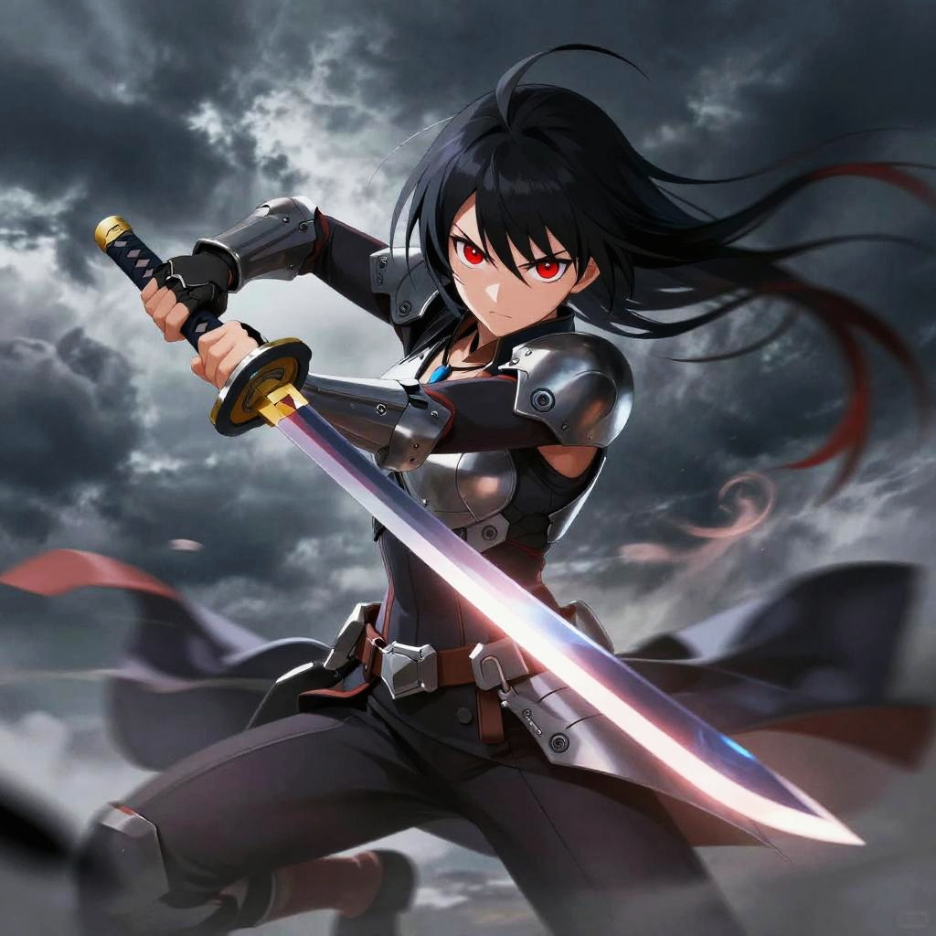 Action scene of a red eye anime girl in mid-battle, wielding a glowing katana, dynamic motion blur capturing her swift movements, her intense red eyes staring fiercely ahead, detailed armor with futuristic accents, stormy skies in background for cinematic effect.
