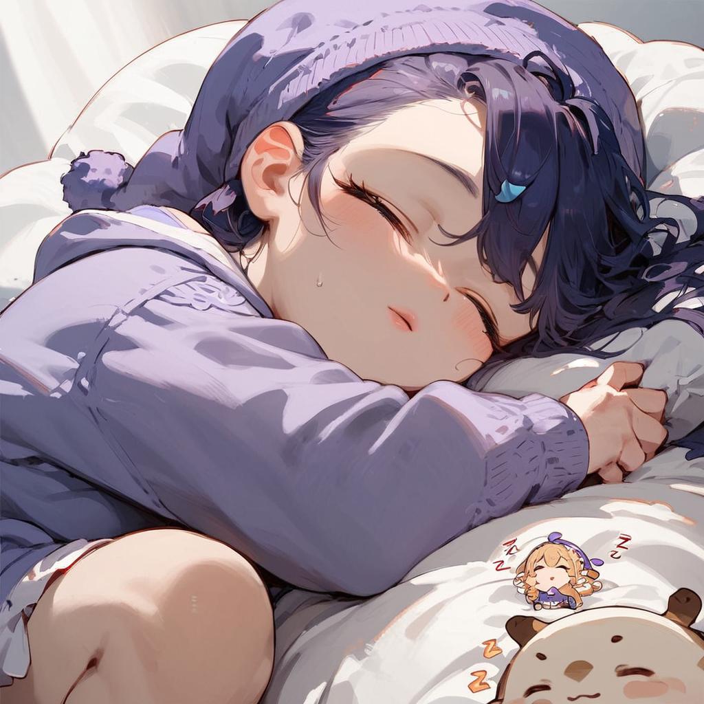 Score_9, score_8_up, score_7_up, source_anime, (chibi), sleeping, zzz, purple nightcap