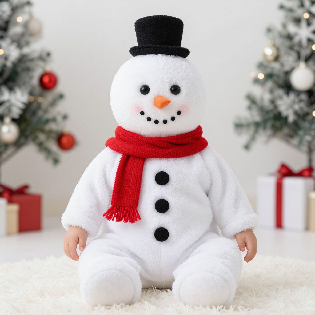 Infant Toddler Christmas Snowman Costume, baby wearing a white snowman outfit and red scarf