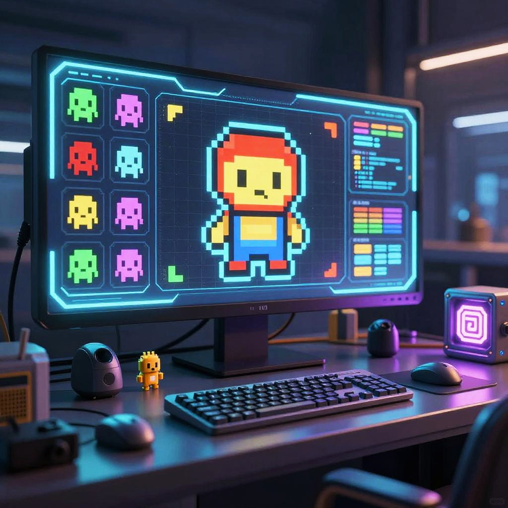 AI game sprite generator concept, a futuristic digital workshop with glowing neon interfaces crafting pixelated 8-bit and 16-bit characters, vibrant color palette, detailed character customization tools, cyberpunk aesthetic, high-tech environment, dynamic holographic sprites floating around