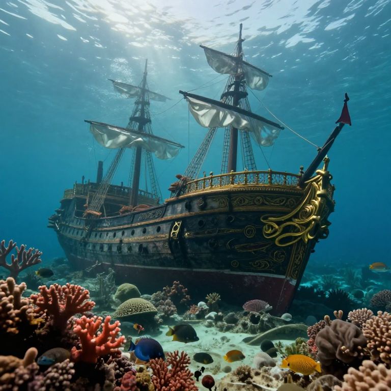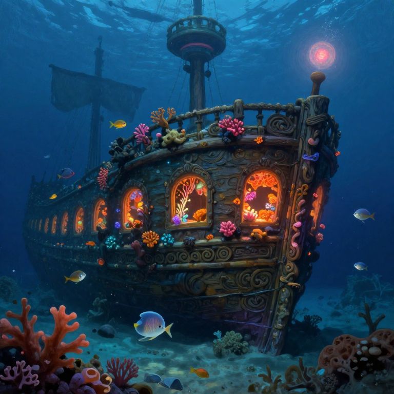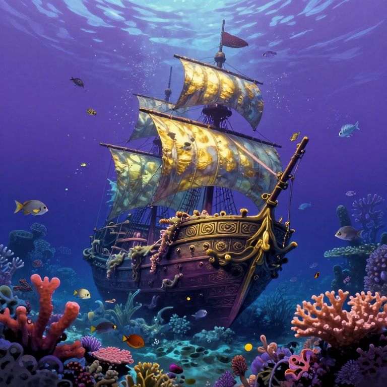 Envision an underwater landscape resembling the fantastical realms of Studio Ghibli animations, viewed from above as one gazes down upon a thriving coral reef filled with diverse marine life. The vivid colors of this aquatic world are dominated by deep purples, blues, and glimmering golds, weaving together in a mesmerizing display beneath the surface. At its heart lies an enigmatic sunken ship, adorned with intricate carvings and enveloped by soft tendrils of algae. As sunlight filters through the pristine water, it bathes the vessel in a warm radiance, highlighting its once-proud sails now draped in seaweed. This scene evokes a spectrum of emotions, from awe to longing, as curious fish playfully explore around the shipwreck, revealing pieces of an ancient civilization submerged beneath the waves.