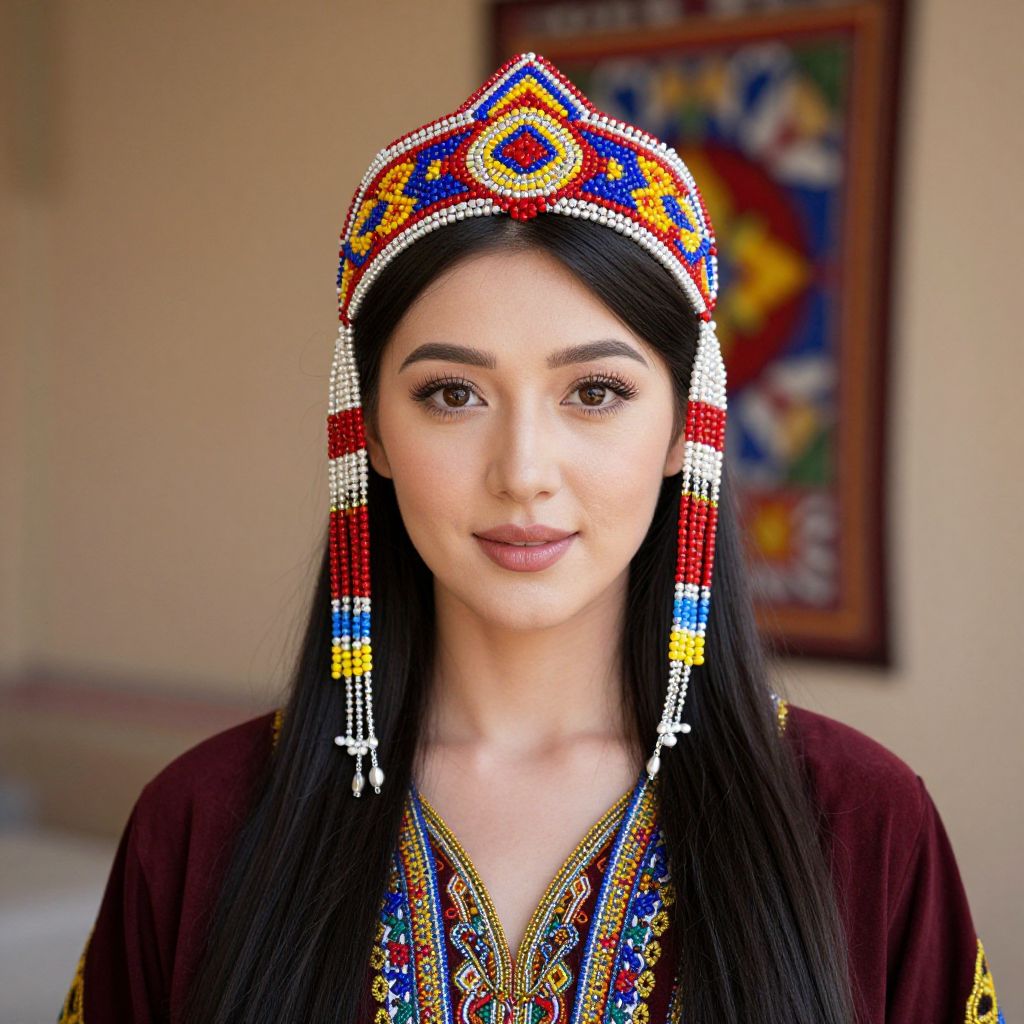 Woman wearing vibrant vintage beaded Uzbek headwear featuring intricate red, blue, and yellow patterns, complemented by matching traditional attire.