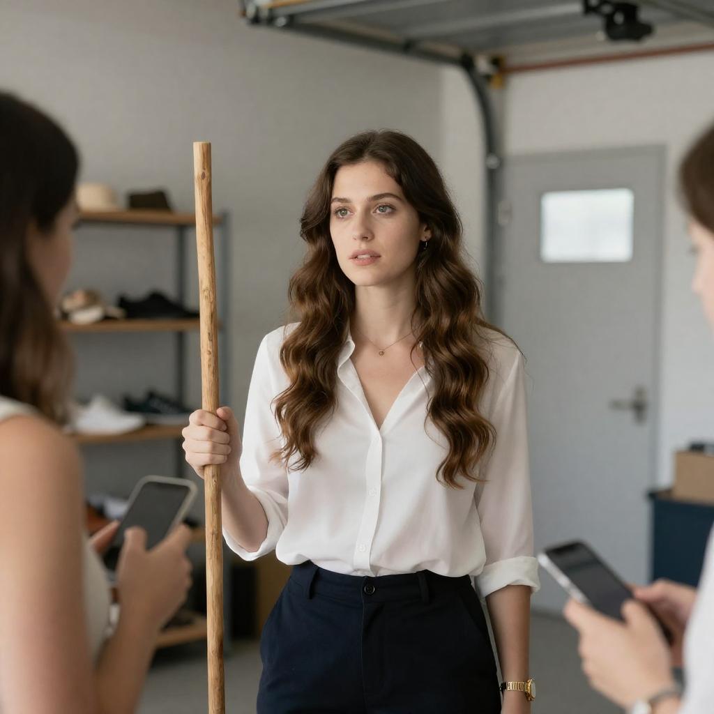 Woman with long, wavy brown hair, white blouse, and dark pants holds a wooden stick, standing in a garage-like room. Another woman with long brown hair, topless, partially visible, holds a smartphone. Background includes shelving and a door. Woman with stick has focused expression.