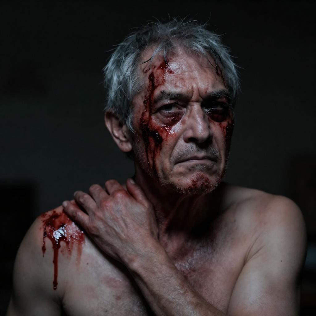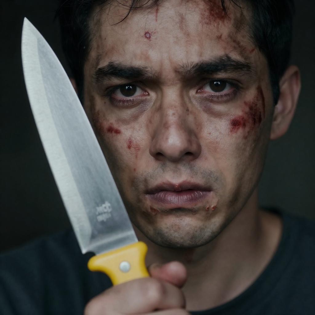 Close-up photograph of a grimy, blood-streaked man with wild eyes and a distressed expression holding a large, sharp kitchen knife with a yellow handle. Dark background. Man's face and knife occupy the foreground.