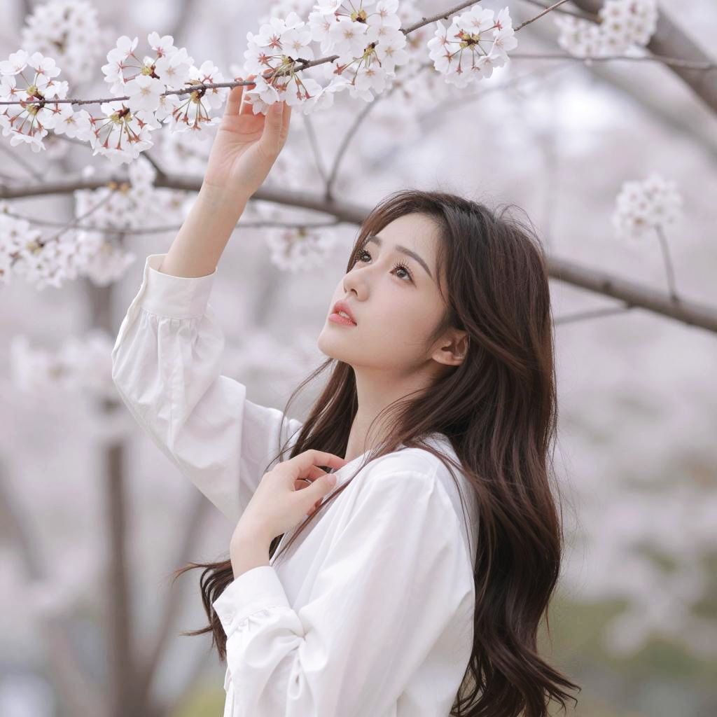 A beautiful young woman poses gracefully among blooming cherry blossoms, exuding elegance and serenity. The soft colors and delicate floral background create a dreamy atmosphere, perfect for spring-themed visuals.