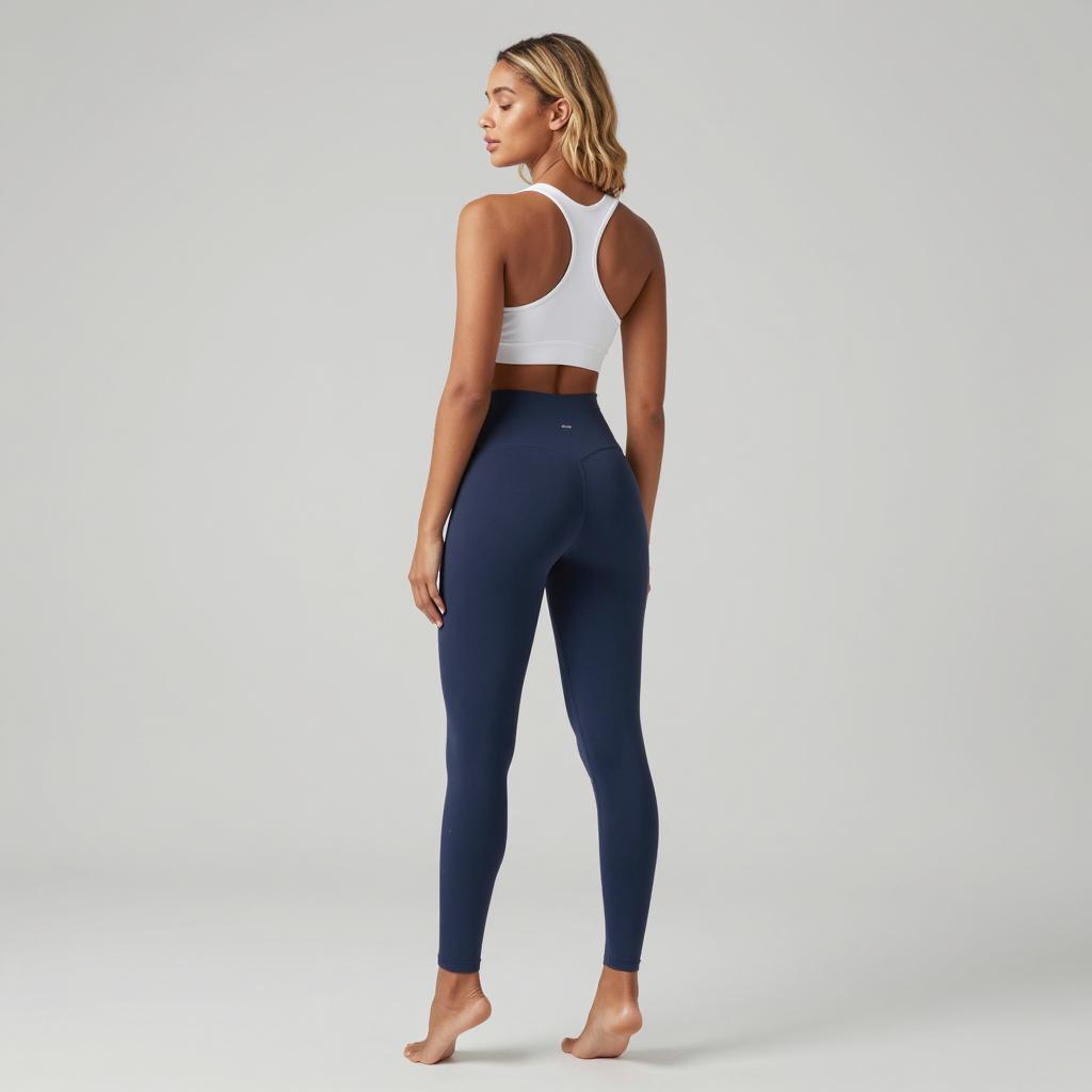 1girl, yoga pants, solo, ass, dark skin, barefoot, dark-skinned female, blonde hair, pants, leggings, sports bra, full body, standing, tiptoes, closed eyes, indoors, tight pants, white sports bra, blue pants, from behind, tight clothes, underwear, sportswear, bare shoulders, long hair