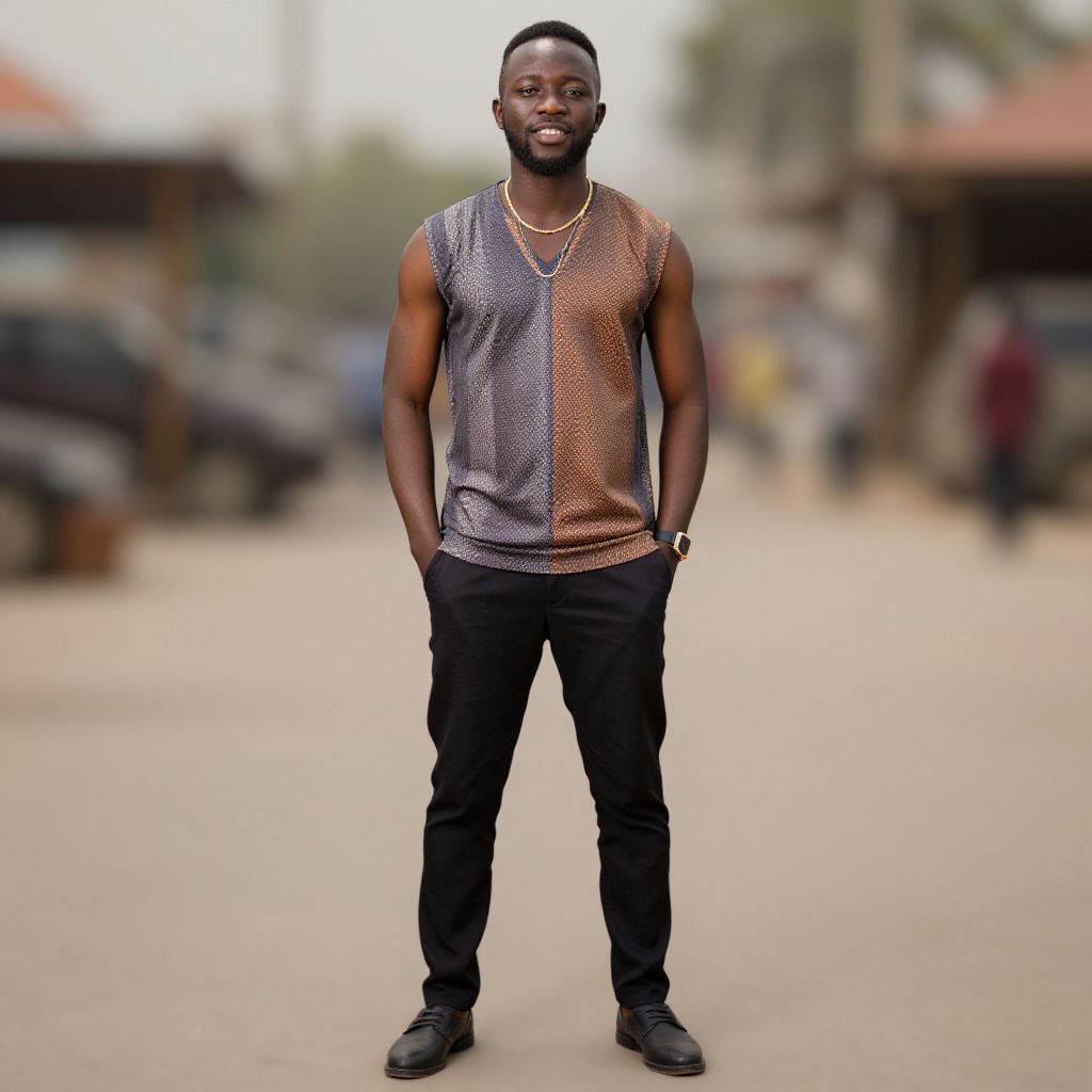 Photograph of a muscular, dark-skinned man with a bald head, wearing a red button-up shirt over a white t-shirt and blue jeans,