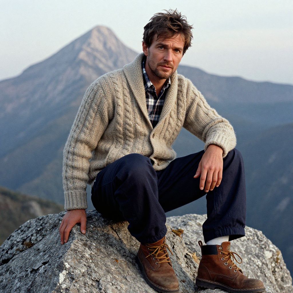 A man, cable-knit shawl collar cardigan, warm beige wool, plaid flannel shirt, relaxed fit navy trousers, rugged brown lace-up boots, majestic mountain peak, anscochrome analog film, contemplative expression Man has masculine face and piercing eyes