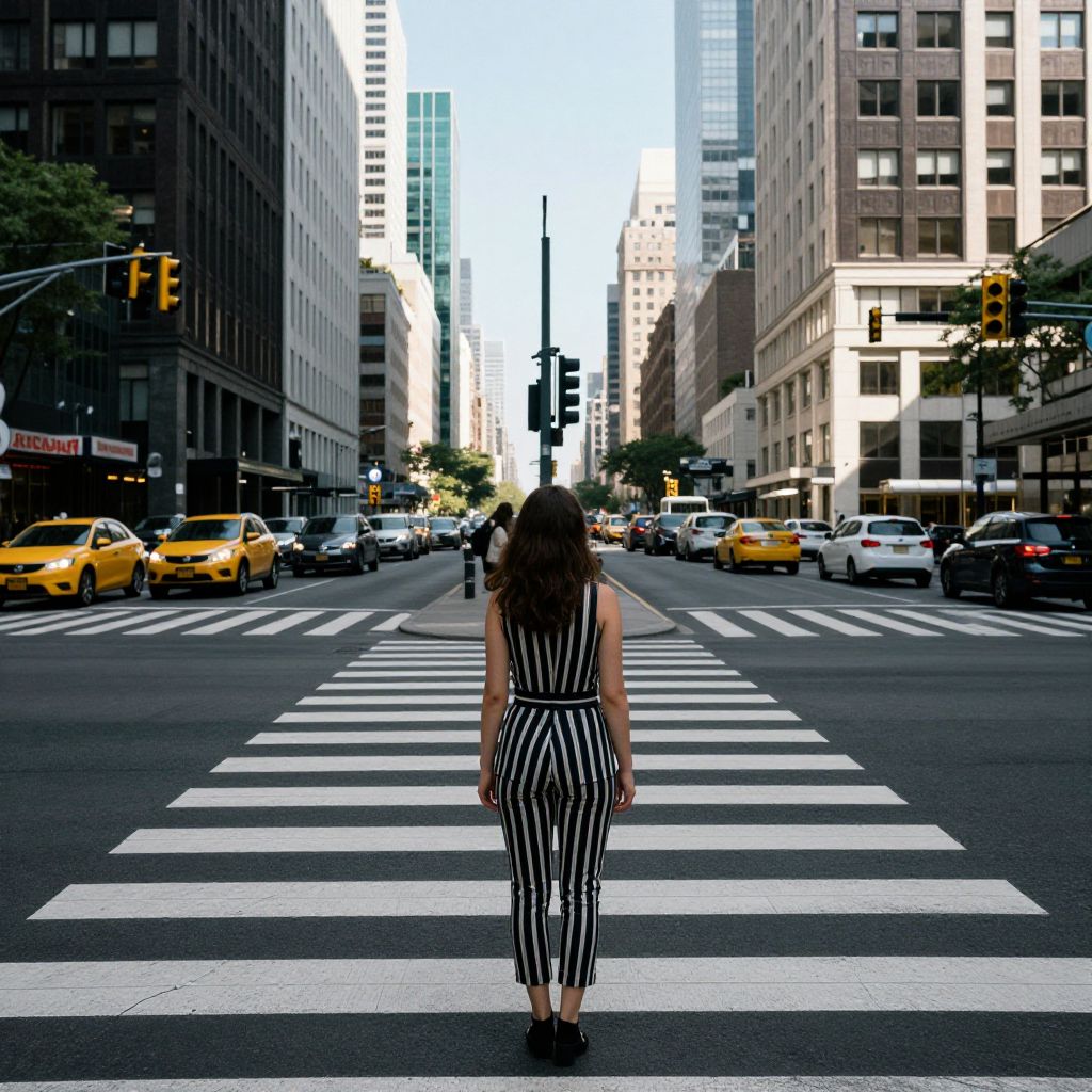 In the heart of a bustling city, a woman stands at a crossroads, lost in thought amidst the urban landscape. The scene is a vibrant tableau of modernity, with tall buildings and traffic lights framing the background. The woman, dressed in a stylish, striped outfit, is positioned in the center of the frame, her back to the viewer, as she contemplates the myriad of options before her. The crossroads, marked by a bold, black and white striped crosswalk, intersects with a busy street filled with cars, their colors muted yet distinct. The lighting suggests it is daytime, casting soft shadows that enhance the realism of the scene. The overall composition is a harmonious blend of natural and man-made elements, creating a sense of depth and perspective. The interplay of colors, textures, and shapes paints a vivid picture of a moment frozen in time, capturing the essence of a city's rhythm and the individual's decision-making process.