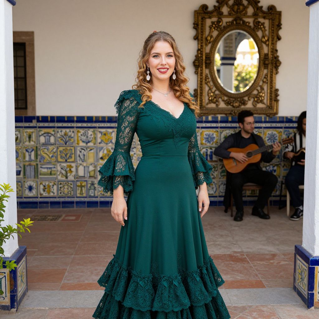 A joyful, mid-20s woman with curly golden-brown hair and bright blue eyes dressed in a full-length Spanish fiesta dress featuring intricate lace details and a deep emerald green hue, posing in front of a sunny courtyard in a restored hacienda, surrounded by hand-painted tiles, gilded mirrors, and Spanish folk music echoing softly in the background.. The woman has big tits and cute face