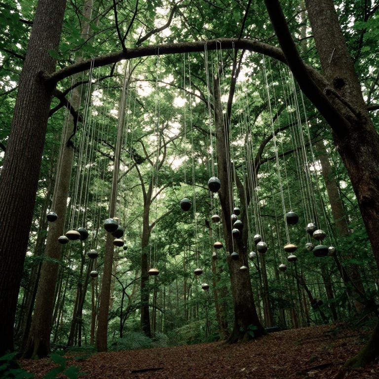 Photograph of a forest scene featuring a large, arched metal framework with numerous thin wires hanging from it, each adorned with spherical, silver ornaments. The background is dense with tall, green-leaved trees, creating a lush, verdant atmosphere. The forest floor is covered in brown, fallen leaves. The light filters through the canopy, casting dappled shadows. The overall composition blends natural and artistic elements, with the hanging orbs adding a whimsical, modern touch to the serene woodland setting. The image has a rich, green and brown color palette.
