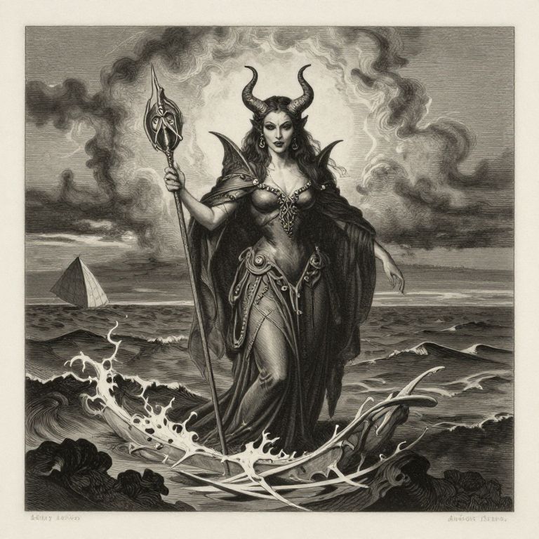 Ink drawing of a dark, horned sea goddess with flowing hair, holding a staff, standing in turbulent waves, with a sailboat in the