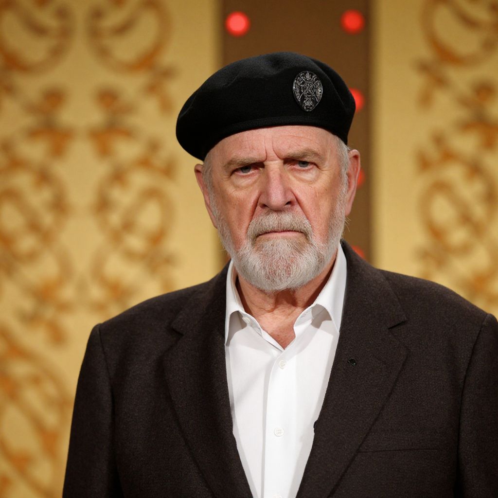This is a photograph of an older white man with a white beard and mustache, wearing a black beret with a silver emblem, a white shirt, and a dark brown textured jacket. He's standing against a warm, golden, patterned background with soft red lights in the background. His expression is serious and slightly stern, adding a sense of authority to his appearance.