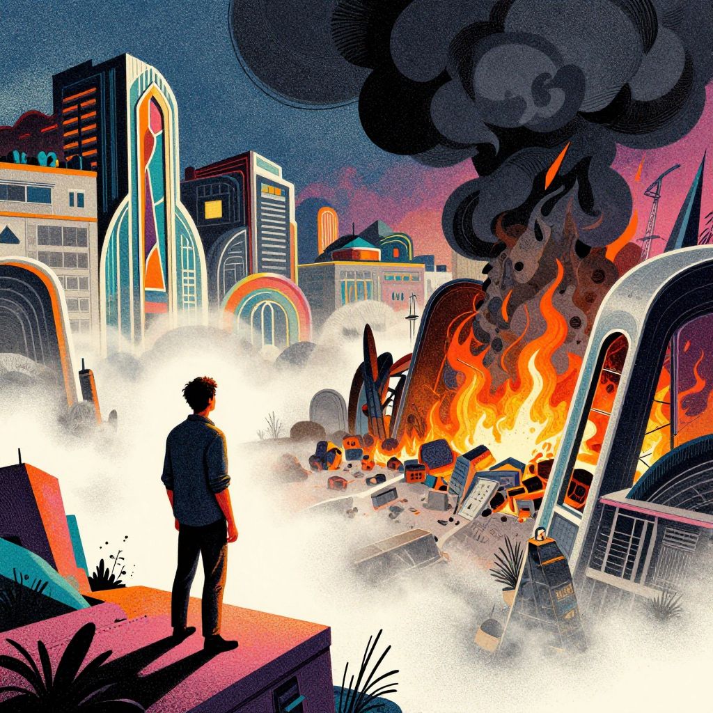 Dot shaded , editorial illustration a lone man looking over habitat 67 burning, smoke, fog modern art deco, colorful, mads berg , christopher balaskas, victo ngai, rich grainy texture, finely detailed, dynamic, wide angle, intricate, risograph , cinematic, sharp focus