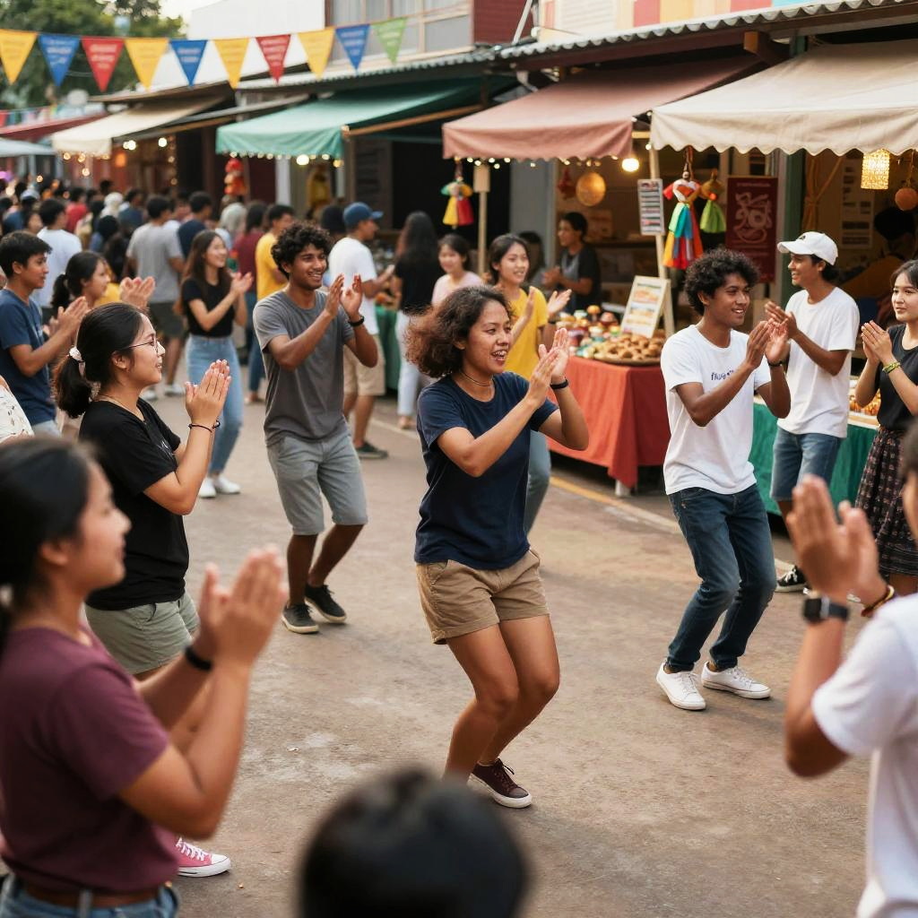 Skibidi dance flash mob in a busy marketplace, joyful crowd clapping and dancing, colorful stalls and decorations, spontaneous celebration, natural sunlight and lively energy