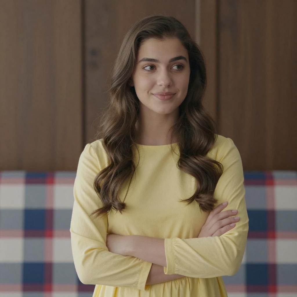 Photograph of a young woman with long, wavy brown hair, wearing a yellow, long-sleeved dress. She stands with her arms crossed, smiling softly. The background features a wooden wall and a blue, red, and white plaid patterned fabric at the bottom. Her skin is light, and she has well-defined eyebrows and subtle makeup. The image has a natural, soft lighting, emphasizing a warm, calm atmosphere. The overall style is casual and approachable.