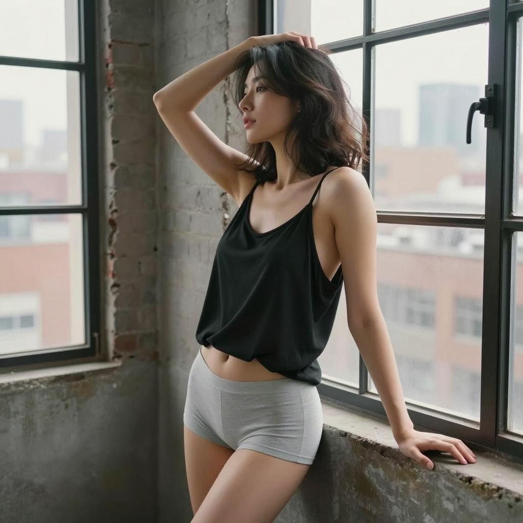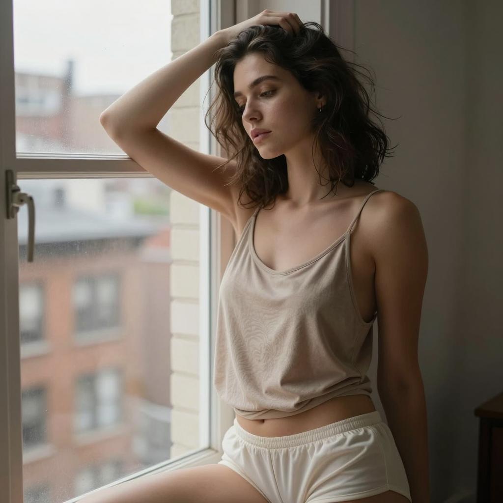 Woman, wearing ultra-loose low-cut draped tank top with thin spaghetti straps layered over soft jersey boyshorts. sideboob, underwear, cleavage, hand on own head, Dressed in dusty blue tank with light oatmeal shorts on woman with straight light brown hair swept to one side posed standing with one leg slightly forward, both arms relaxed at her sides in city loft with bare brick pillar and blurred skyline beyond the glass, patches of sunlight and shadow across her body from the window frame, intimate lifestyle fashion photography, high resolution, ultra-detailed