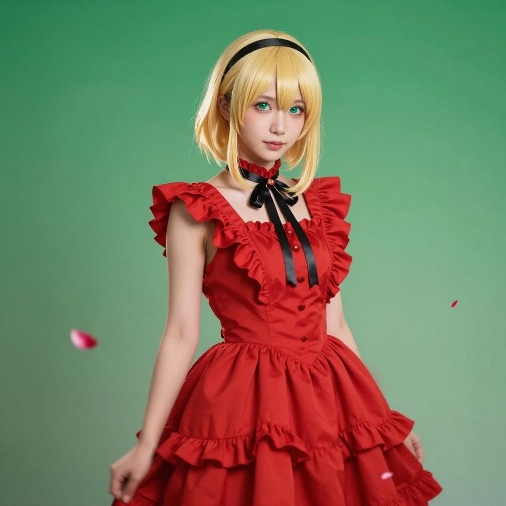 Sakurai Momoka, 1girl, blonde hair, blurry, blurry foreground, dress, frilled dress, frills, gradient background, green background, green eyes, hairband, looking at viewer, medium hair, neck ribbon, petals, red dress, ribbon, solo, two-tone background