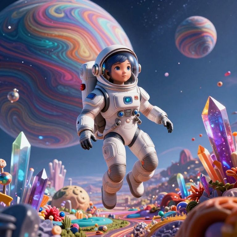 Jordana depicted as a space explorer on an alien planet, futuristic suit design with glowing tech, rugged terrain with exotic plants, twin moons in the sky, sci-fi art style with vibrant color palette and detailed textures