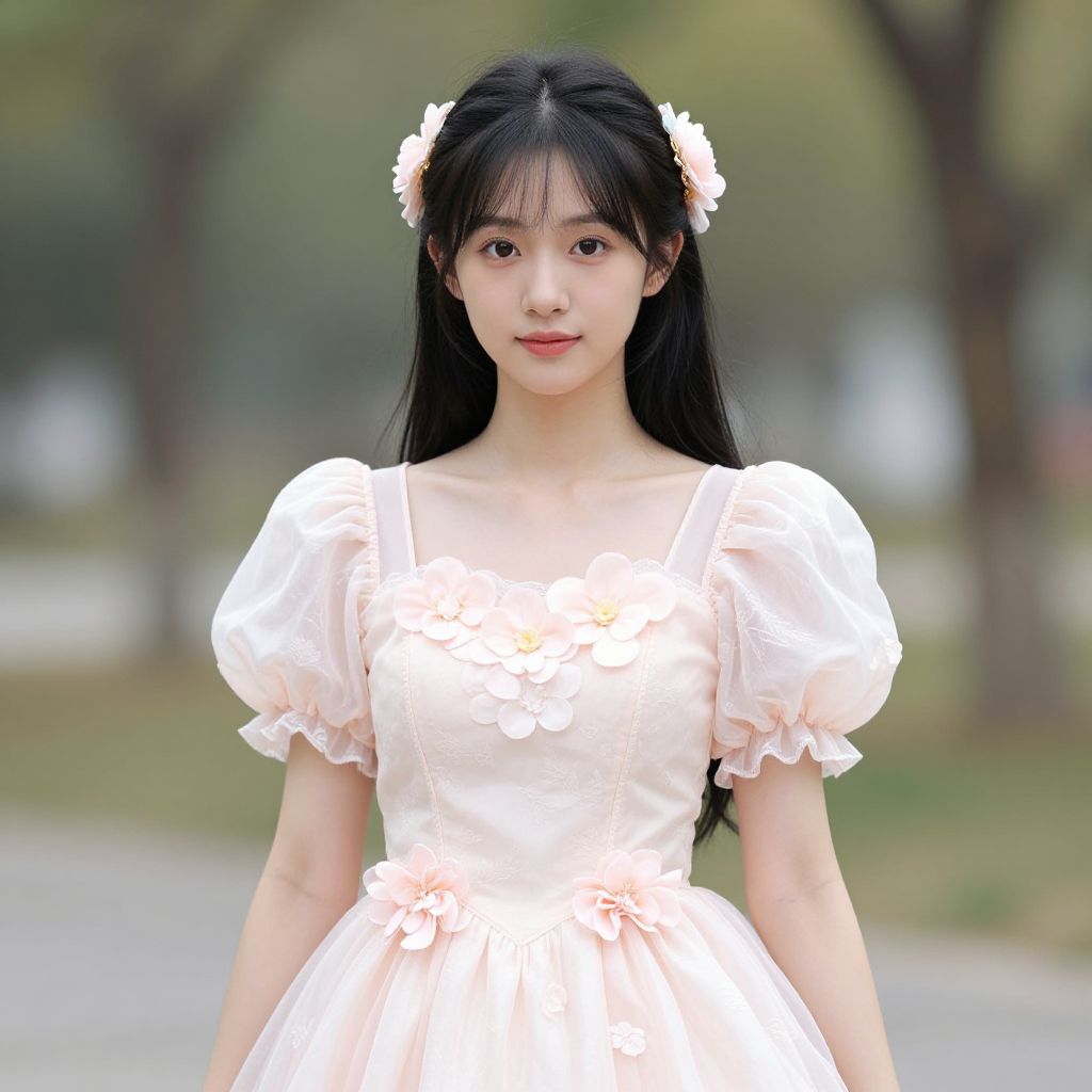 Pretty woman costume vivian, 1girl, solo, flower, dress, hair ornament, hair flower, long hair, blurry, outdoors, black hair, blurry background, looking at viewer, puffy sleeves, short sleeves, day, puffy short sleeves