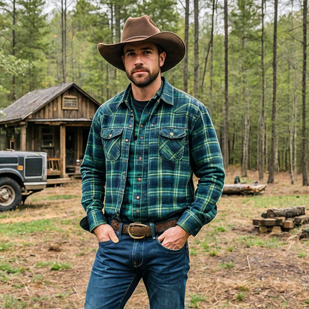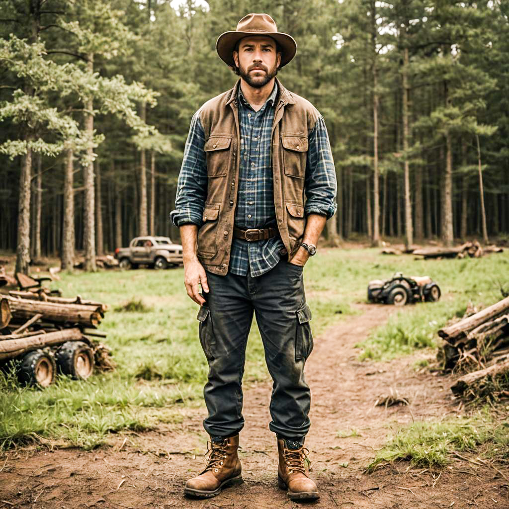 Photo of a Rugged Build man, Short Curls, country outfit, flannel shirt with cargo pants and steel-toed boots, earthy tones