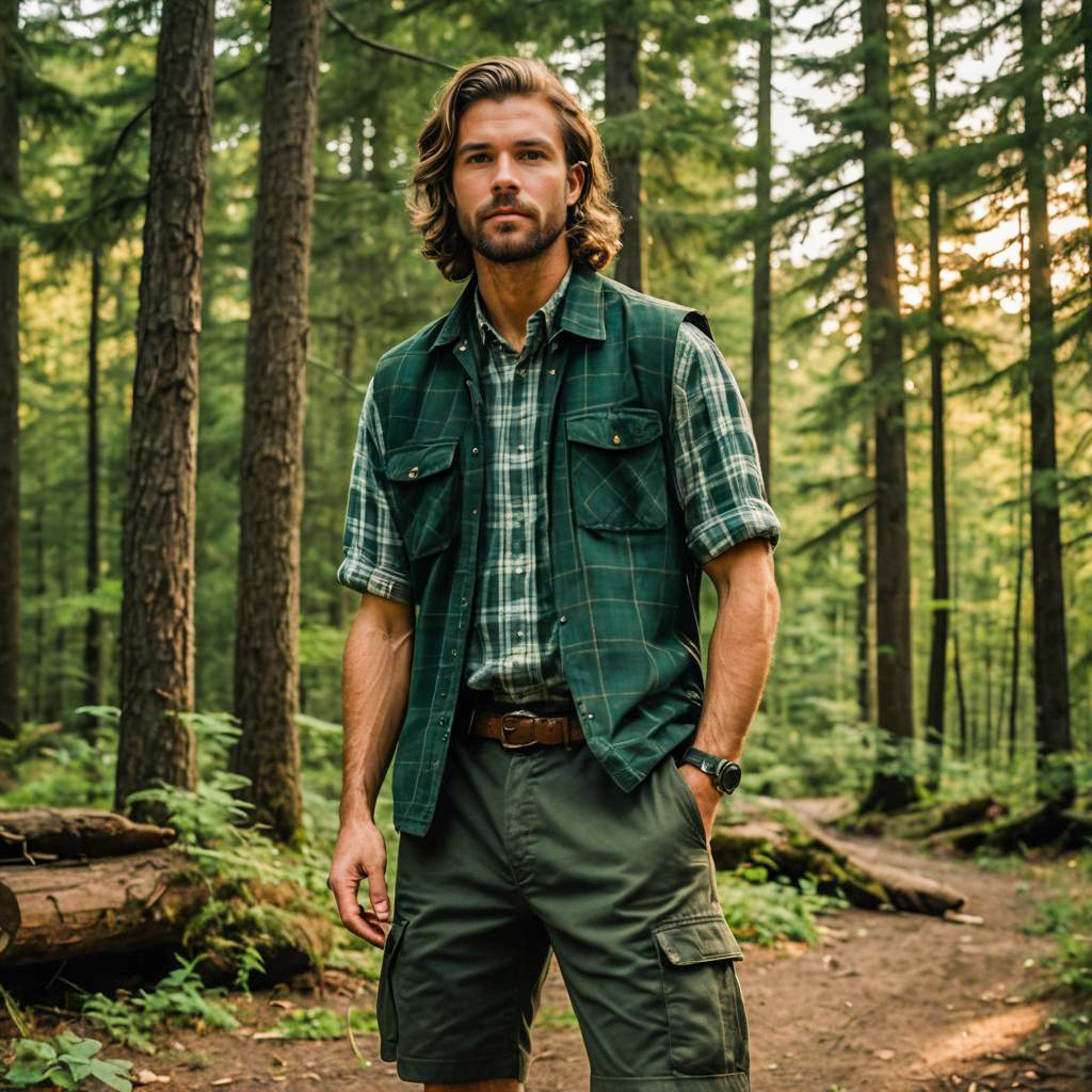 Portrait of a rugged build man with short curly hair wearing a brown wide-brimmed hat, green plaid flannel shirt, olive green button-up shirt, cargo pants, and tan steel-toed boots. He stands confidently on a dirt path in a dense forest clearing with logs and rustic equipment in the background, showcasing an earthy outdoors style.