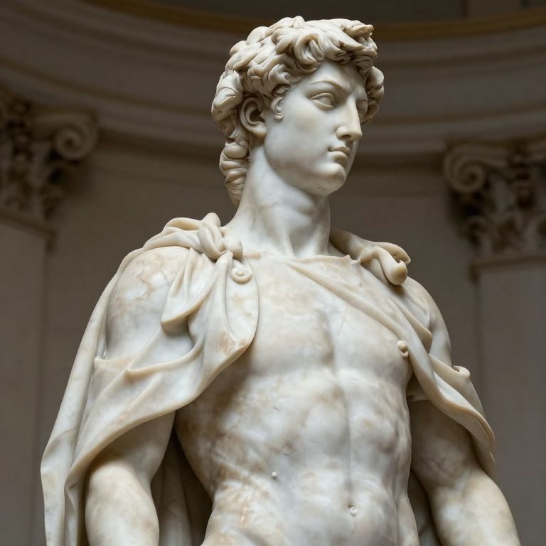 Photograph of a classical marble statue depicting a muscular, shirtless male figure with wavy, curly hair and a stern expression. He wears a draped cloth over his shoulders, detailed with smooth, flowing lines. The statue's surface is polished, reflecting light, highlighting the sculptor's precision in capturing muscle definition and facial features. The background is a dimly lit, curved architectural structure with ornate, classical columns, suggesting an indoor museum or gallery setting. The statue's pose is upright, with shoulders slightly back, conveying a sense of dignity and strength. The overall color palette is dominated by the white marble of the statue and the muted, grayish tones of the background.