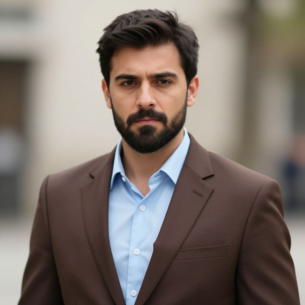 Brown suit wolverine, male focus, 1boy, facial hair, beard, solo, shirt, blue shirt, short hair, looking at viewer, blurry background, upper body, realistic, blurry, mature male, jacket, collared shirt, brown jacket, black hair, mustache, outdoors, suit, formal, thick eyebrows
