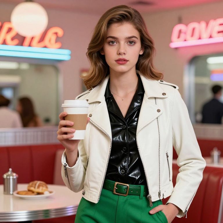 A young girl in her late teens with smooth, fair skin and bright brown eyes wearing a classic greasy 1970s grease outfit, including a white leather jacket with a shiny black leather vest, green trousers, and a matching leather belt. She stands confidently in a retro diner setting with neon signs glowing in the background, holding a cup of coffee in her hand, the atmosphere warm and nostalgic.