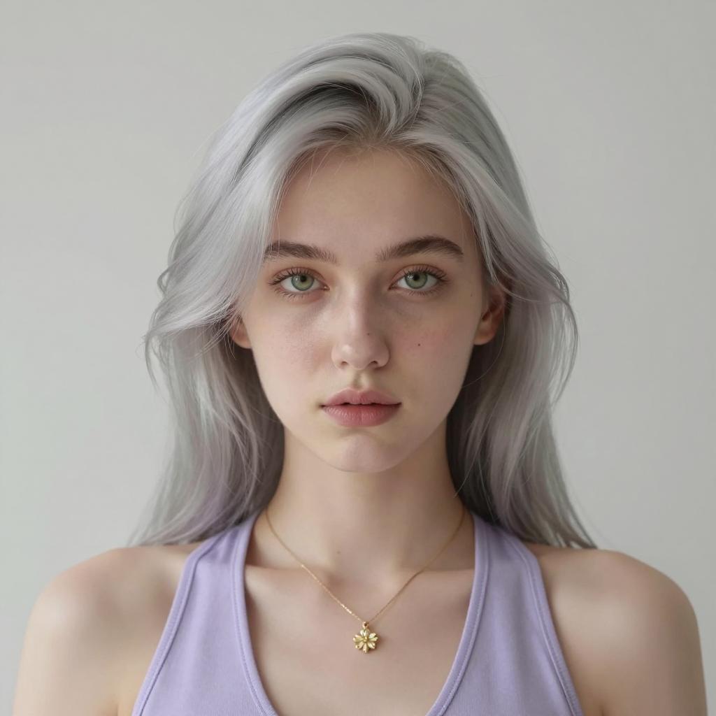 Hilariously bad halloween, close-up photo of a young woman, blonde hair in a side braid, light skin, green eyes, subtle makeup, white top, serious expression, soft light, shallow depth of field, natural look, realistic, high detail, portrait style, realistic lighting, no visible background, centered in frame