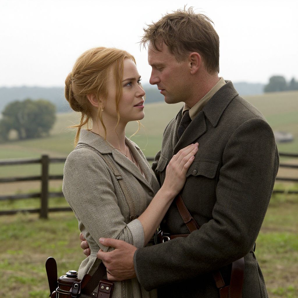 Nicole Kidman and Jude Law share a tender moment in Cold Mountain, a Civil War-set drama where she portrays a woman awaiting her beloved's return, set against a serene countryside backdrop.