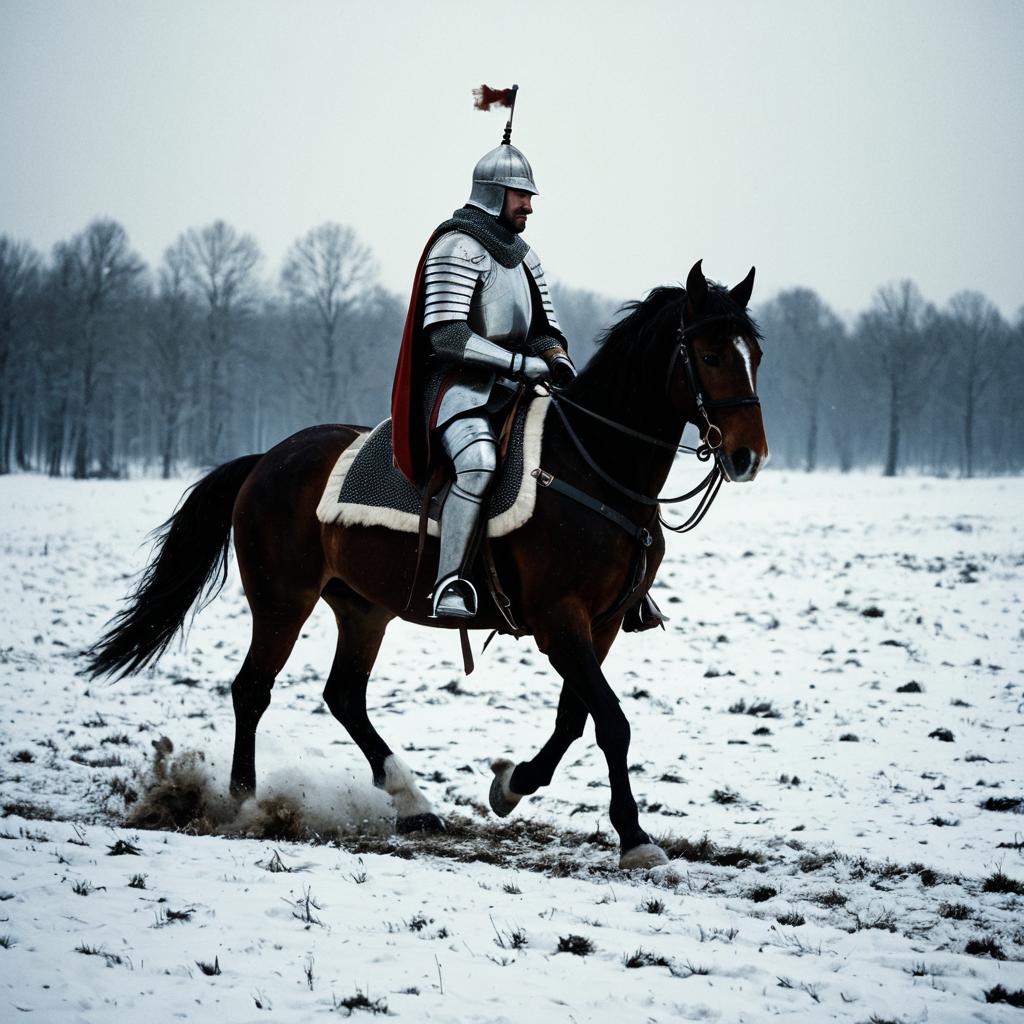 A noble knight wearing full medieval armor, including a steel helmet with a red plume and chainmail, riding a brown horse on a snowy battlefield. The scene depicts a cold winter environment with barren trees and falling snow, enhancing the historical and realistic atmosphere.